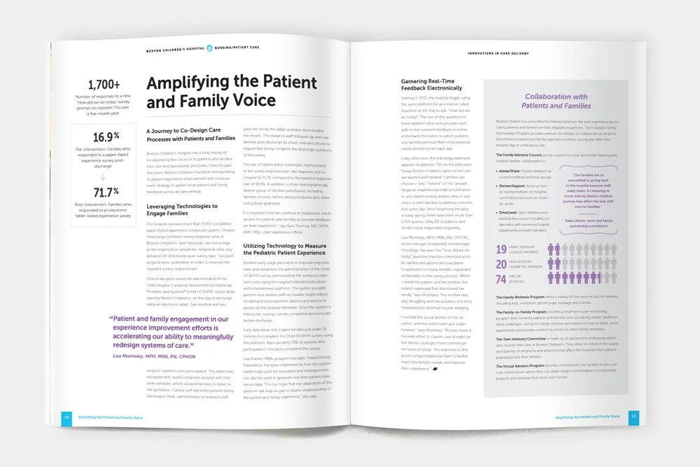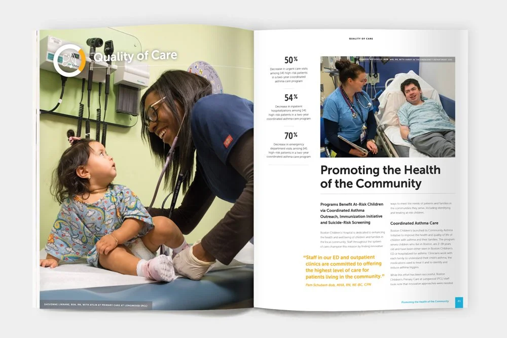 To design a report to showcase the work being done by the nurses at Boston Children’s Hospital. The work included typographic and infographic design, page layout, and photography.